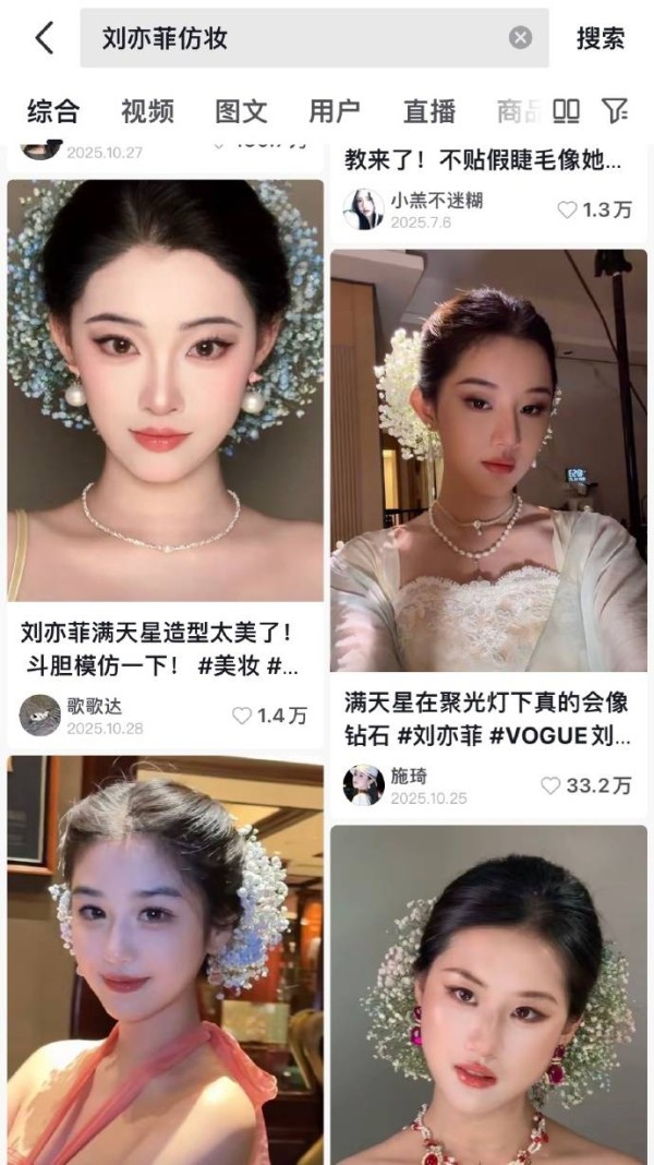 事情的源头要追溯到刘亦菲在2025年10月Vogue盛典红毯上的满天星造型。那套被外媒误认为高级珠宝的头饰,单价仅14-50元,却经刘亦菲演绎后成了全网追捧的美学符号,进而掀起了一场席卷社交平台的仿妆潮。抖音主播“柳柳”正是抓住了这个风口,她偶然仿妆刘亦菲的满天星造型后,直播间观众从不足200人暴涨至超2000人,尝到甜头后,她直接将这种妆容固定下来,还发展成了多人团播模式。两个仿妆主播同框跳舞的片段,凭借“仙气造型+女团舞”的强烈反差感,迅速成为爆款,单场观众破万,“像她三分便是绝色”成了这场流量盛宴的核心口号。