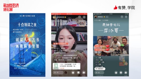 举几个例子,最左边是我们的十点领读之夜,由我们培养的十点领读官主持,领读官是十点读书的会员、分销员,很多领读官可以服务一个群、两个群,每周办一个十点领读之夜,这时候每周的领读之夜成为十点读书每周的会员日,也就是分销员的节日。他们在直播间有特定的圈层交流,他们可以服务他们的用户,并在服务他们用户时产生成就感、价值感。