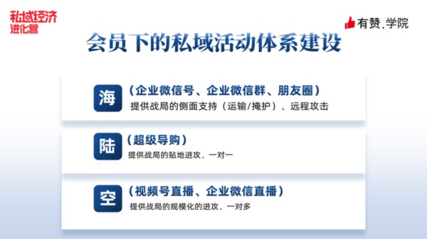 怎么打通呢?我们有一套会员下的私域活动体系建设。可以用一个很形象的比喻,「海陆空军团」。