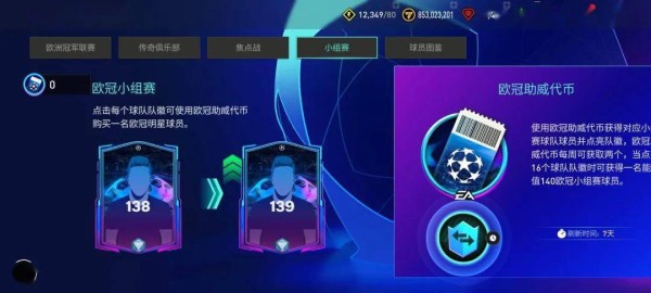 小组赛章节中,玩家可以通过球员交换获取欧冠助威代币,每周可以参与两次交换,获取2枚欧冠助威代币。