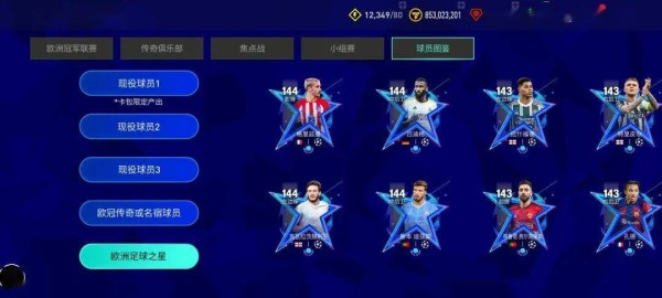 球员图鉴章节中,玩家可以查看欧冠小组赛活动中不同系列的的球员卡。