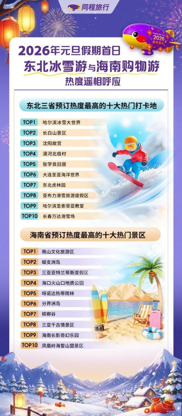 2026年元旦假期首日,国内各大机场、车站、高速公路迎来客流高峰。同程旅行数据显示,在旅游度假叠加返乡探亲,以及丰富的跨年活动带动下,国内酒店预订热度相比去年同期增长超3倍。此外,在海南全岛封关、冰雪旅游热以及多国免签等利好刺激下,元旦假期首日呈现出国内旅游南北双向奔赴、出境旅游短途热度高的特征。