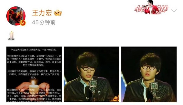 此前,方大同曾客串过王力宏的电影《恋爱通告》。王力宏发文悼念方大同,配文“方大同一路好走,安息,愿他的音乐永远流传”。