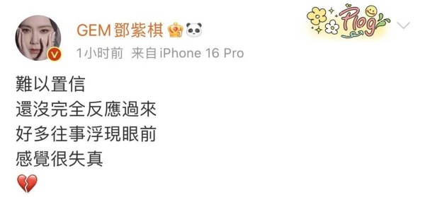 邓紫棋发文称:“难以置信 还沒完全反应过来 好多往事浮现眼前 感觉很失真 ”。两人曾在《我是歌手》的舞台上合作过一曲《春天里》。