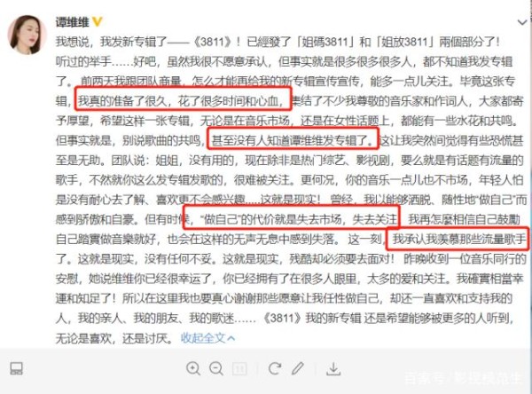 今天歌手谭维维微博发声,抱怨自己发了新专辑,可是很多人很多人都不知道,同时表示羡慕那些流量明星。她认为:“做自己的代价就是失去市场。”