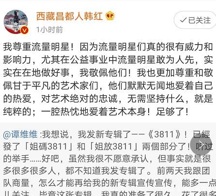 韩红表示:“我尊重流量明星!因为流量明星们真的很有威力和影响力,尤其在公益事业中流量明星敢为人先,实实在在地做好事,我敬佩他们!我也更加尊重和敬佩甘于平凡的艺术家们,他们默默无闻地爱着自己的热爱,对艺术绝对的忠诚,无需坚持什么,就是纯粹的;一腔热忱地爱着艺术本身!足够了!”