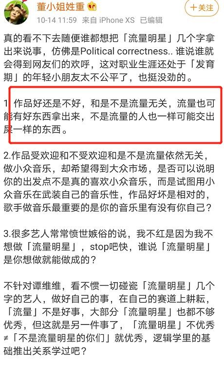 同时网络上还有另一批声音,专辑无人问津该不该甩锅给“流量明星”,有人认为,作品好不好和是不是流量无关,流量也能又好东西,不是流量的人也有可能交不出好东西,是金子总会发光,不要动不动找理由“因为自己不是流量”。