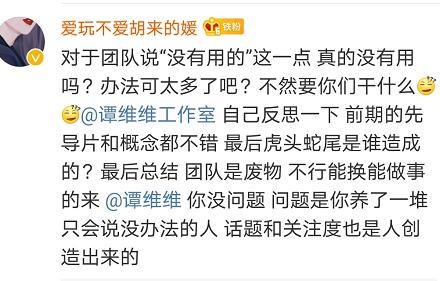 更有眼尖的网友从微博里分析出:“对于团队说‘没有用的’,这一点 真的没有用吗?办法可太多了吧?不然要你们干什么。”并@谭维维工作室 ,让他们自己反思一下 前期的先导片和概念都不错 最后虎头蛇尾是谁造成的?