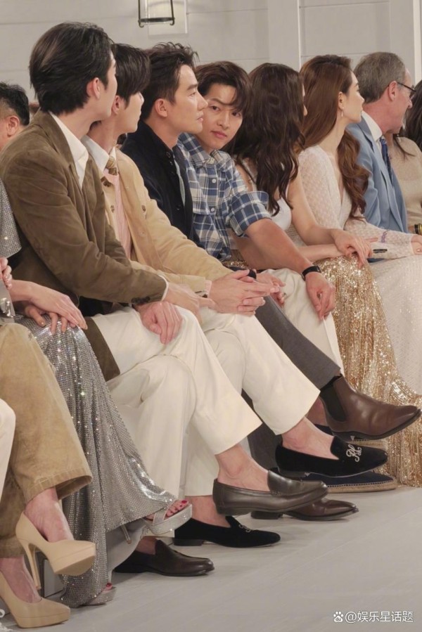 黄轩身着拉夫劳伦经典米白色丝绸西装,搭配同色系褶皱衬衫,将品牌2025早春主打的"浅春系"柔雾色调穿出了东方文人独有的温润感。腰间点缀的鼠尾草绿丝质方巾,与秀场发布的潘通早春灵感色遥相呼应,被时尚博主评价为“把松弛感穿出了诗画意境”。而宋仲基则以黑色丝绒戗驳领西装惊艳亮相,领口处若隐若现的银线刺绣与腕间J12 Bleu系列腕表相映成趣,将韩式贵公子的精致发挥到极致,被外媒称赞“重新定义了暗黑系华丽”。