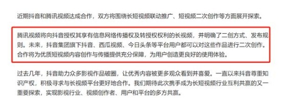 抖音和腾讯视频的合作主要包括两个方面:长短视频联动推广和短视频二次创作。具体来说,就是腾讯视频将向抖音授权其享有信息网络传播权及转授权权利的长视频,并明确了二创方式、发布规则。未来,抖音集团旗下抖音、西瓜视频、今日头条等平台用户都可以对这些作品进行二次创作。双方在公告中称,“合作将为优质短视频内容创作与传播提供充分保障,为用户创造更良好的使用体验。”