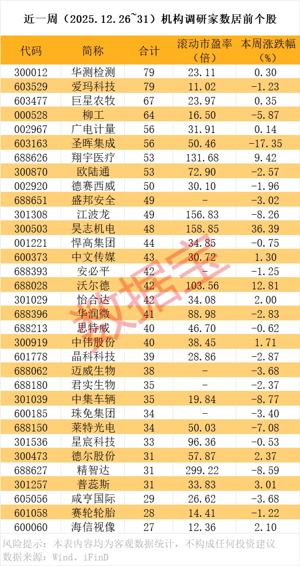 近一周机构调研个股有200多只,华测检测调研机构数最多。