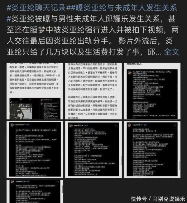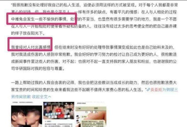 然而,炎亚纶的个人生活却不像他的职业生涯那样顺利。2018年,关于他劈腿三名男生的新闻曝光,引发了轰动效应。他的私密照片和聊天记录被人公开,尽管炎亚纶已经承认自己是同性恋,但一次与三名男生的恋情同时进行,引起了舆论的强烈反响。在这些事件发生后,炎亚纶的公司和他本人最初否认了这些事情,称只是朋友间的互动,并未超出界限。可最终,舆论的压力让炎亚纶不得不公开道歉,并承认了自己与多人存在不正当关系。他的道歉声明中提到,自己未能妥善管理个人生活,导致伤害了他人,并对此深感遗憾。