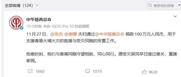 多位明星艺人为香港火灾捐款!韩红周深一马当先,张柏芝捐100万港币