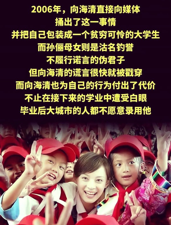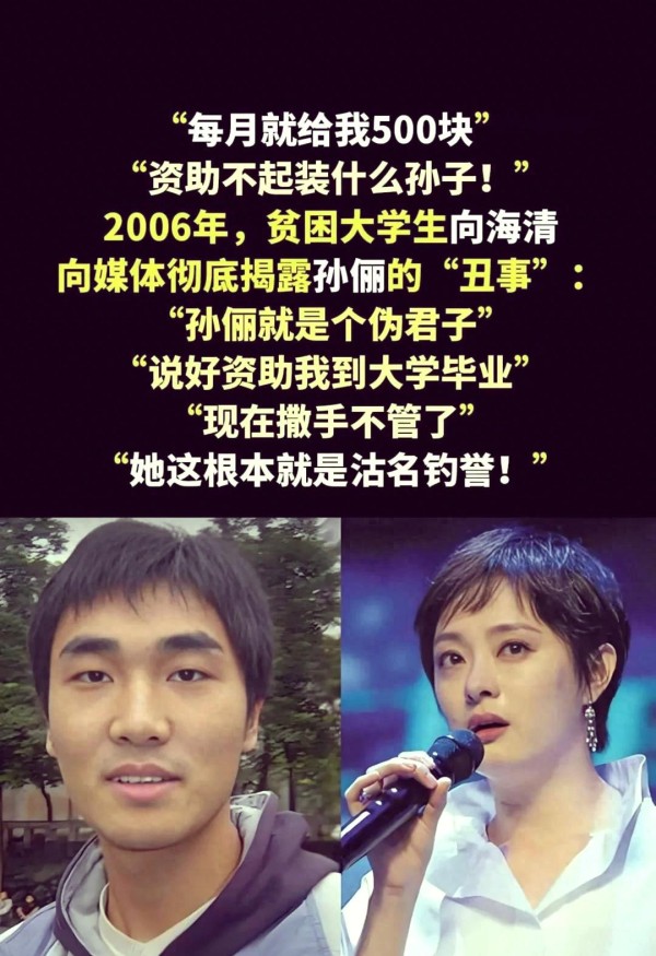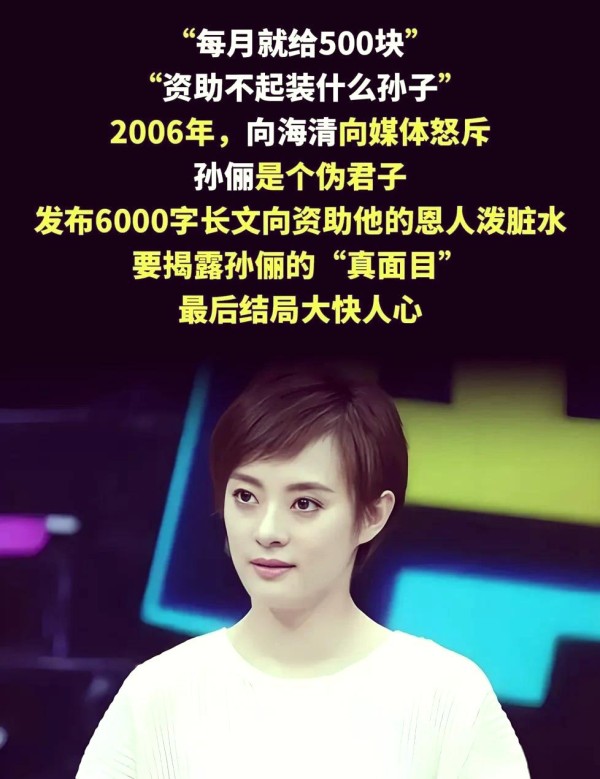 2006年秋季,向海清公开发声,对孙俪提出质疑,并撰写了一篇长达6000字的文章。他在文章中声称,每月500元的资助远远不够其日常开支,甚至表示孙俪的母亲干预了他担任学生会干部的竞选。令人痛心的是,他竟然在文中流露出“明星收入丰厚,却过于吝啬”的不满情绪。
