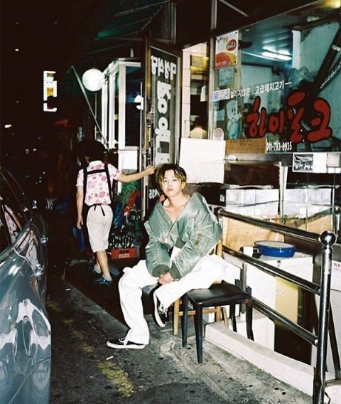 照片中以华丽的招牌和老旧的建筑物为背景,GD则穿上破格的时尚衣著十分抢镜,要滑下的外套也十分性感。白色下衣和运动鞋,显现了休闲时尚。