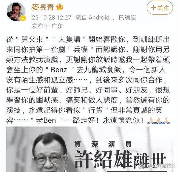 你知道吗?要是这世上有一种“假消息”能把整个娱乐圈都掀个底朝天,那十月末的这出“许绍雄被死亡”事件肯定是榜上有名。10月30号晚,那天刷微博的TVB老粉怕是经历了一场情感过山车——先是港媒传得欢天喜地,说“欢喜哥”许绍雄因胰腺神经内分泌肿瘤离世,女儿许惠菁发了黑白图片,黄宗泽跟着贴出了老剧《叠影追击》的片场合影,还配文“老豆走好”,直接把网友虐得手机都拿不稳了。结果呢?一小时后,这剧情竟然来了个港剧式大反转。