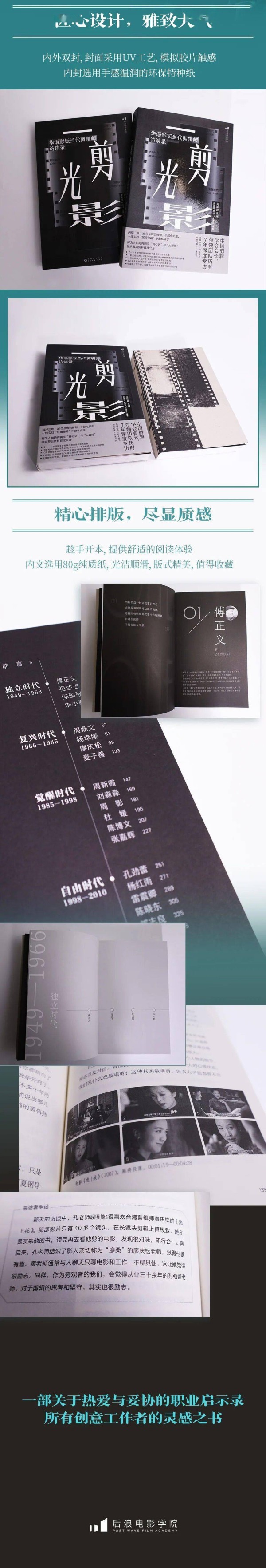 书中还收录了丰富的行业洞见:关于剪辑本质,他们视之为“拿着镜头作画”,重在“选择讲故事的方式”,其终极追求是“准确”;关于创作要领,他们强调“生活比电影更重要”,指出“套模式不难,破模式才难”,并相信“找到限制才会找到自由”;关于职业修养,他们自视为“后期导演”,坦言常有“改行做编剧的冲动”,并格外看重“音乐修养”;关于创作体悟,他们既沉醉于“获得两百多倍人生”的丰厚体验,也谦逊地自称“只是照料影片的保姆”,并将“把50分的片子剪成75分”视为最大的快乐。这些凝结数十年经验的真切话语,构成了一部兼具深度、温度与实用价值的职业启示录。