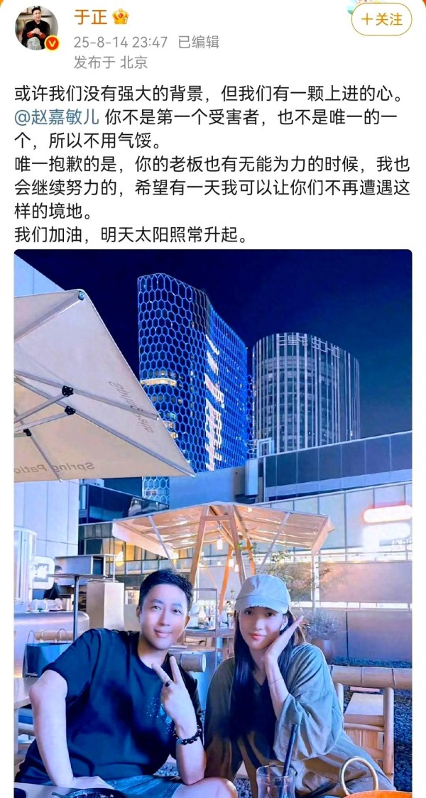 于正在微博上发了一张和赵嘉敏的合照,配文说:"或许我们没有强大的背景,但我们有一颗上进的心。"这话听着挺励志,但细品一下,是不是有点无奈?他还在直播里直接点名行业潜规则,说"连某大导家的女艺人都被换了,何况我们这种小角色"。这话一出,网友直接炸锅——原来连大导演捧的人都逃不过被换的命运,那普通演员岂不是更惨?