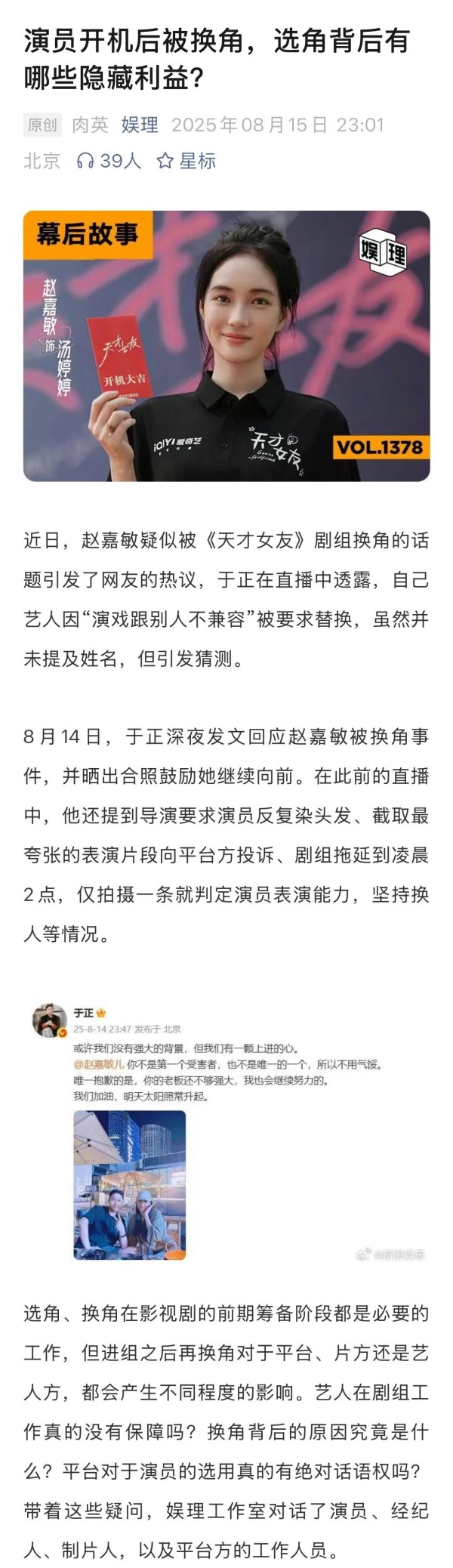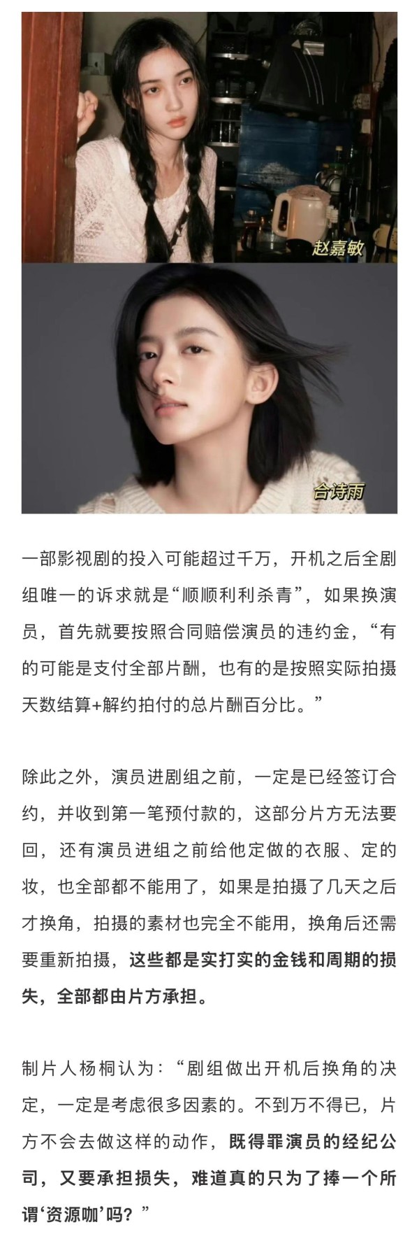 某制片人对此也表示认可:“剧组做出开机后换角的决定,一定是考虑很多因素的。不到万不得已,片方不会去做这样的动作,既得罪演员的经纪公司,又要承担损失,难道真的只为了捧一个所谓‘资源咖’吗?”#造乐一夏#↓
