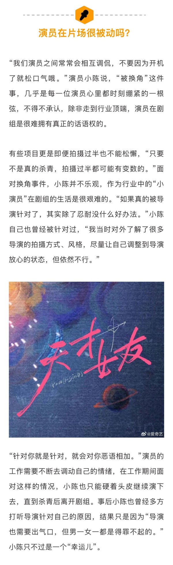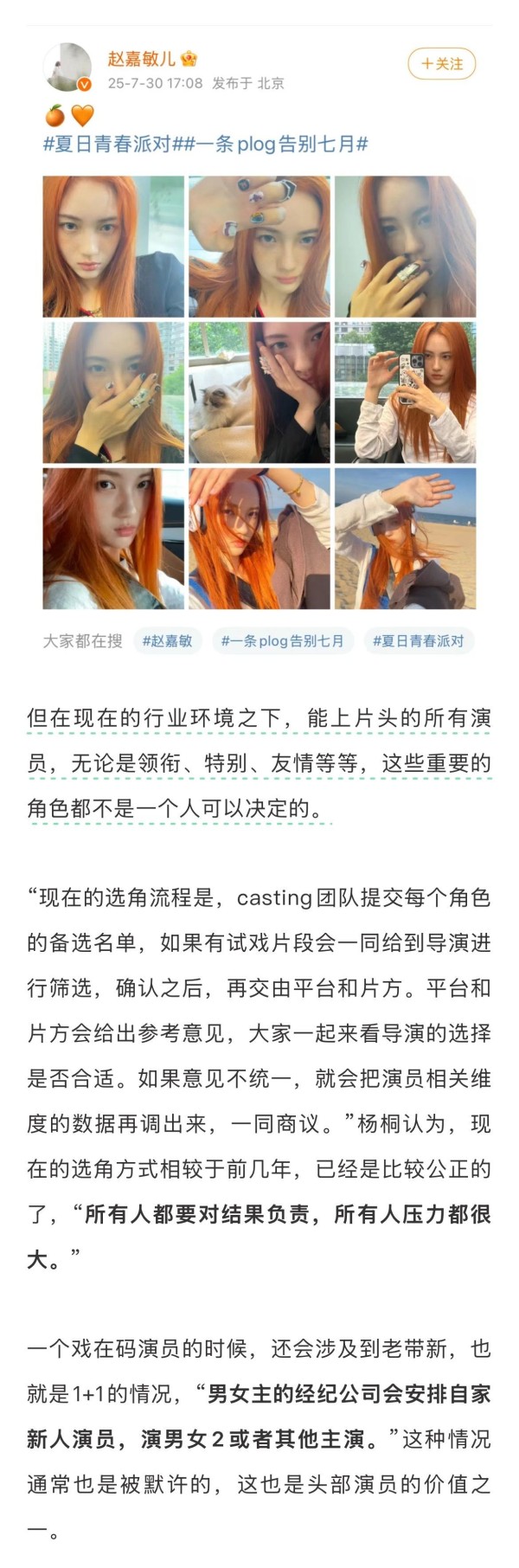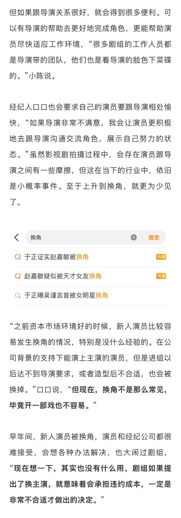 #业内谈影视剧换角问题##经纪人谈平台选角标准# 近日,赵嘉敏疑似被《天才女友》剧组换角引发热议和猜测。谈及此事,某演员直言“只要不是真的杀青,拍摄过半都可能有变数的。”ta还表示拍摄时和导演处好关系很重要。某经纪人也表示认可,“之前资本市场环境好的时候,新人演员比较容易发生换角的情况,特别是没什么经验的。但现在,换角不是那么常见,毕竟开一部戏也不容易。”