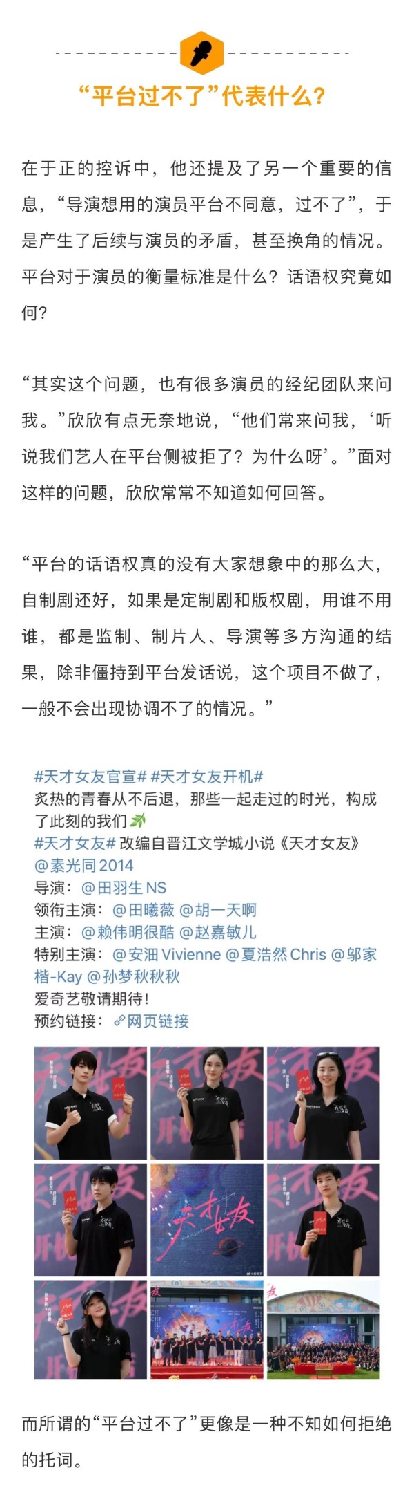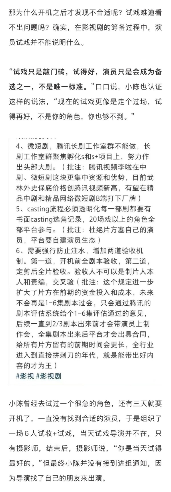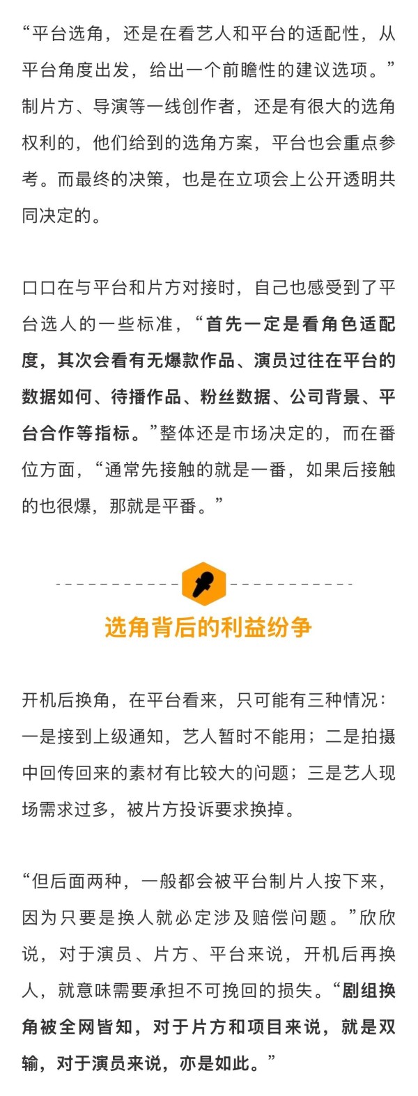 谈及平台对演员的衡量标准及话语权,某从业者称平台的话语权没有那么大,“自制剧还好,如果是定制剧和版权剧,用谁不用谁,都是监制、制片人、导演等多方沟通的结果,除非僵持到平台发话”。而所谓的“平台过不了”更像是一种不知如何拒绝的托词。”而开机后再换人,就意味需要承担不可挽回的损失。