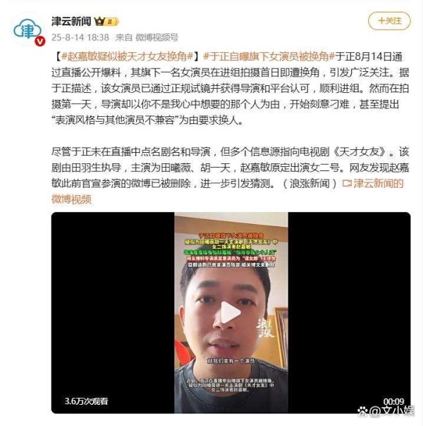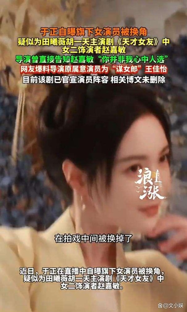 于正称该女演员已通过正规试镜并获得导演和平台认可,顺利进组。然而在拍摄第一天,导演却以你不是我心中想要的那个人为由,开始刻意刁难,甚至提出“表演风格与其他演员不兼容”为由要求换人。尽管于正未在直播中点名剧名和导演,但多个信息源指向电视剧《天才女友》。网友发现赵嘉敏此前官宣参演的微博已被删除,进一步引发猜测。