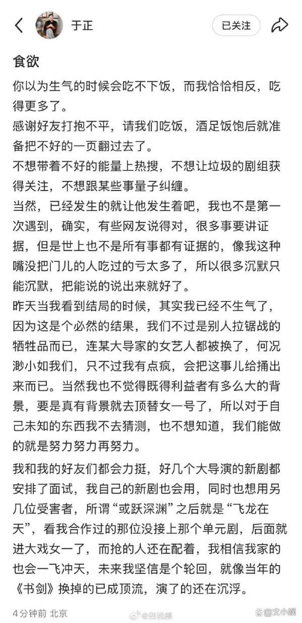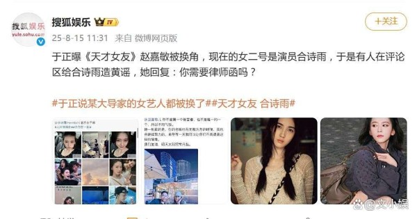 8月15日,于正在社交媒体发文,虽未点名剧组,但字字诛心:“我们不过是别人拉锯战的牺牲品……连某大导家的女艺人都被换了,何况渺小如我们。”他更透露业内换角已成常态,甚至举例“当年《书剑》换掉的已成顶流,演了的还在沉浮”,暗示赵嘉敏“塞翁失马”。