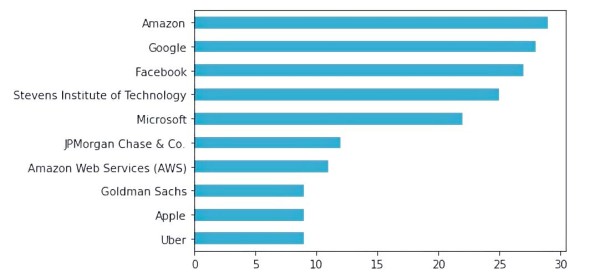接下来,我们分析社交网络中的公司分布。通过df['company'].value_counts().head(10)的代码,我们可以统计出出现频率最高的前十个公司。然后,我们使用plot(kind="barh")函数将这些公司的信息以水平条形图的形式展现出来。通过这个图表,我们可以清晰地看到各个公司的联系人数分布情况。