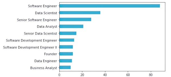 统计并展示社交网络中主要职业的分布情况,我们通过执行df['position'].value_counts().head(10).plot(kind="barh").invert_yaxis()这段代码,将结果以水平条形图的形式展现出来。从上述图表中,我们可以清晰地看到,软件工程师职业在作者的人脉网络中占据了主导地位。