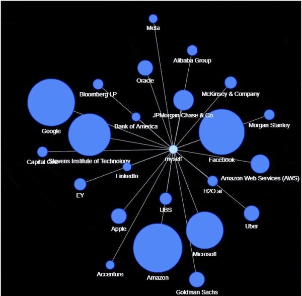 在探讨社交网络的可视化过程中,我们首先从作者的人脉出发,统计了他们所属的公司,并进行了排序。节点代表社交网络中的参与者,边表示参与者之间的关系。我们将使用networkx和pyvis模块来简化社交网络的绘制过程。