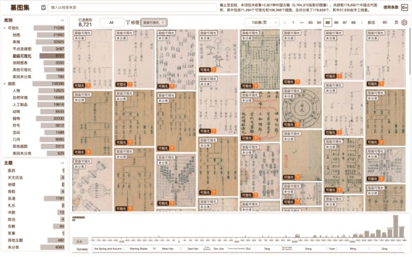 课题组首先通过人工收集了来自古籍器物的441项可视化案例,于2023年构建了首个小型中国古代可视化数据集(图2)。在初步收集后,课题组选定中国古籍作为主要收集方向,通过建立半自动化的收集流程从提供在线接口的各国图书馆所藏中国珍稀古籍收藏电子文档中提取相关古代可视化图像(图3)。目前已经从12,800多种中文古籍中标注提取了近71,300份可视化图像,以及近108,400份示意插图。包括此前手动收集案例,全部可视化样例时间跨度接近2500年。课题组还开发了交互式浏览系统(图1),支持用户按可视化形式,内容主题,出现时间等多维度过滤检索相关图像。