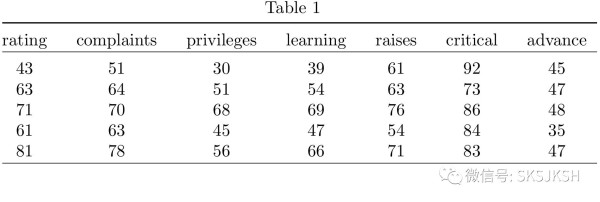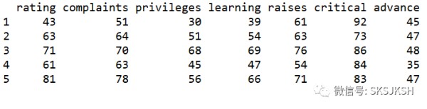 以R语言自带的数据集attitude为例,我们将表格的前5行数据输出: