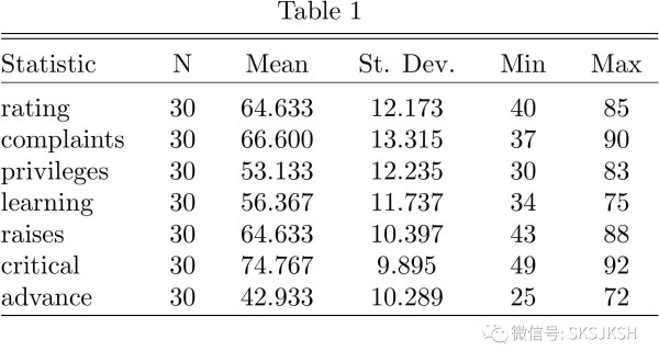data( "attitude") #读入数据集summary(attitude) #输出R语言自带的描述性统计结果stargazer(attitude) #使用stargazer生成LaTeX语言下的描述性统计表格