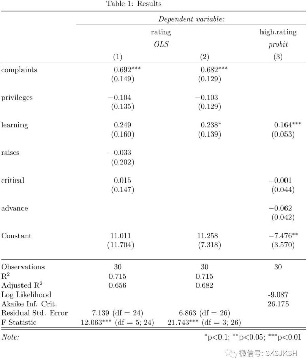 attitude$high.rating <- (attitude$rating > 70) #新生成一列上面提到的 0- 1指示变量probit.model <- glm(high.rating ~ learning + critical + advance, data=attitude, family = binomial(link = "probit")) #用probit模型进行回归stargazer(linear .1, linear .2, probit.model, title= "Results", align=TRUE) #输出上述 3个回归的表格