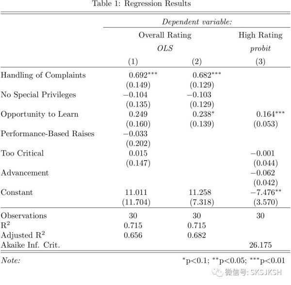 我们再做一个OLS,被解释变量仍为评分,自变量换为complaints, privileges和learning: