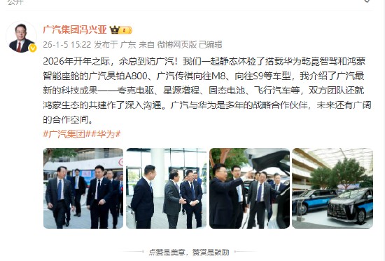 1月5日消息,广汽集团(8.190, 0.03, 0.37%)董事长冯兴亚发微博表示,2026年开年之际,余总(余承东)到访广汽!