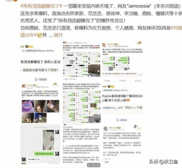 元旦假期凌晨,司晓迪这个网红在社交平台突然发了一堆东西,说她三十岁那会儿睡遍了娱乐圈的顶流,还贴出鹿晗、蔡徐坤他们十几个男艺人的聊天记录、转账截图和照片,消息一出来,粉丝们全乱了,有人怕自家偶像被拖下水,有人后悔自家哥哥没上这个名单。
