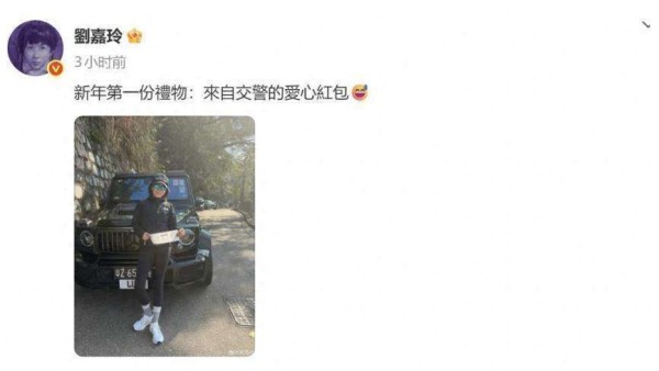 照片中,刘嘉玲身穿一套黑色运动装,戴着墨镜和棒球帽,站在自己的奔驰车旁,手里举着罚单微笑着。她配的文字也很有趣,说道:新年的第一份礼物:来自交警的爱心红包。这一幕发生在上海,她因为停车违规,收到了400港币的罚款。