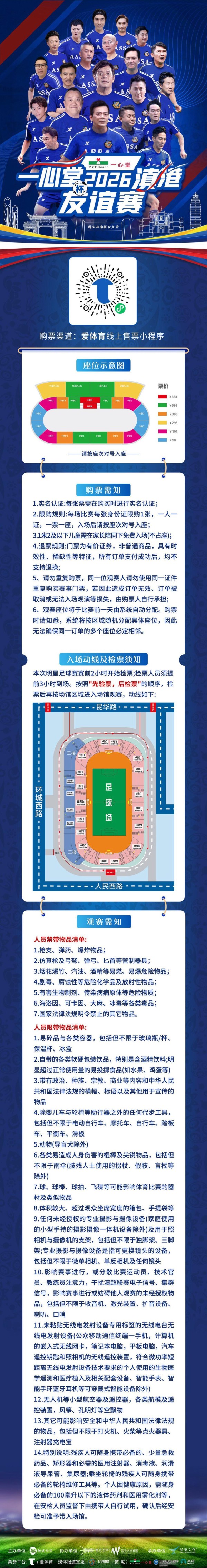 为确保活动顺利进行,主办方已公布购票及观赛须知。据悉,本次赛事门票将采取实名制购买,每张身份证限购一张,门票一经售出不予退换。1.2米及以下儿童可在家长陪同下免费入场(不占座)。为保障观赛体验,座位将由系统在赛前随机分配。检票工作将于赛前2小时开始,观众需遵守“先验票,后安检”的流程入场。