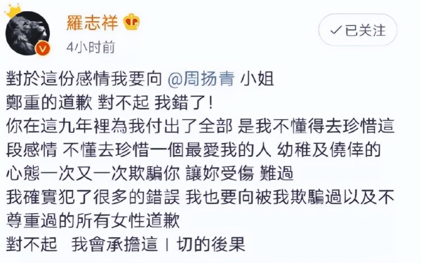 然而,2020年4月,前女友周扬青爆料其私生活混乱,包括多次劈腿等行为,导致罗志祥形象崩塌,他随后公开道歉,事业陷入停滞。这一事件成为他职业生