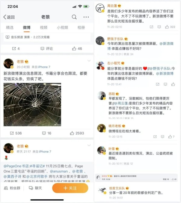 这次站出来的是音乐人,一向以温和形象示人的老狼难得在公众场域发作,发微博称:“新浪微博演出信息限流,书籍分享会也限流,都要花钱买头条,穷疯了吧。”很快,周云蓬、野孩子乐队、左小祖咒等一大批独立音乐人们云集在这条微博之下表达不满。