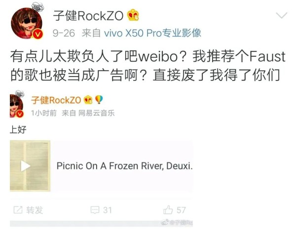 一方面,对于独立音乐人们,除了微信公众号和短视频账号等私域流量,在微博发布演出信息是能获得一定声量的少数公开渠道,微博“被夹”直接影响他们的生计;另一方面则看起来更不可理喻,他们分享音乐和书籍的信息也会被判“广告”,刺猬乐队主唱子健提到自己分享歌手Faust的音乐也“被夹”,那是1993年的老歌了。
