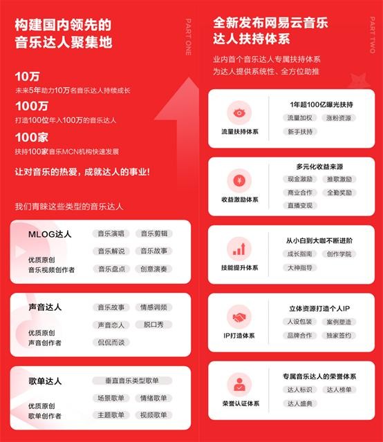 12月16日,网易云音乐发布音乐达人战略,宣布将构建国内领先的音乐达人聚集地,在未来助推超10万音乐达人持续成长,孵化100个年入100万的音乐达人,扶持100家音乐MCN机构快速发展。同时,平台还推出了业内首个音乐达人专属扶持计划。