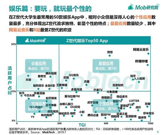 数据显示,95后用户占比超60%,2019年新增用户中95后占比超85%。Mob研究院报告显示:娱乐APP中,“网易云音乐和B站最受Z世代的欢迎”。