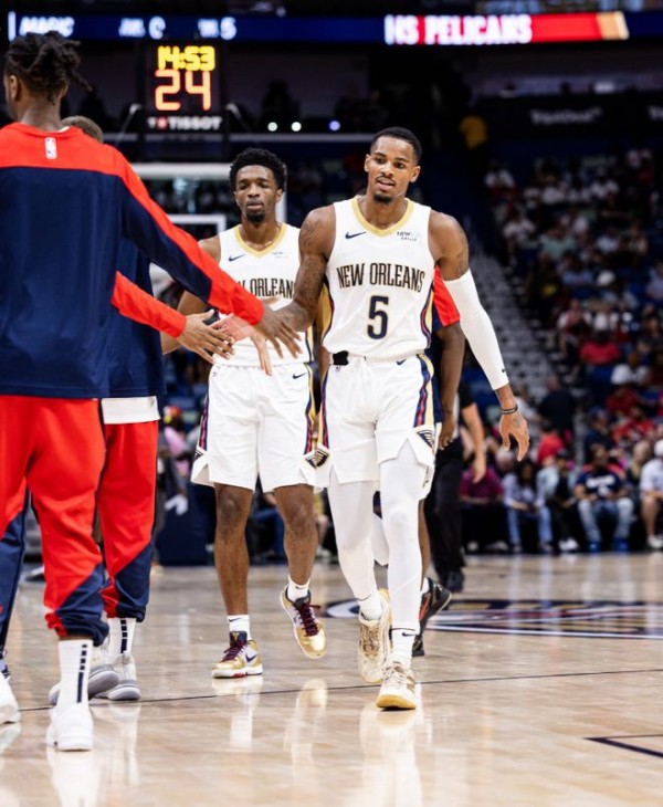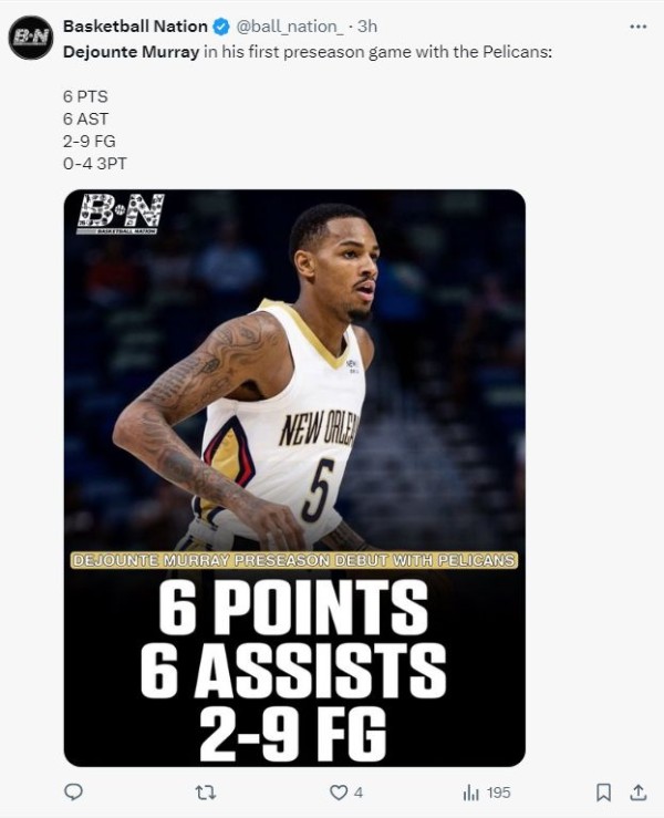 德章泰-穆雷是由鹈鹕今夏在交易中得到,鹈鹕送出戴森-丹尼尔斯、EJ-利德尔、小拉里-南斯、科迪-泽勒(通过先签后换)以及两个未来的首轮选秀权从老鹰换来,也就是6换1,这场比赛是穆雷在鹈鹕的首秀。