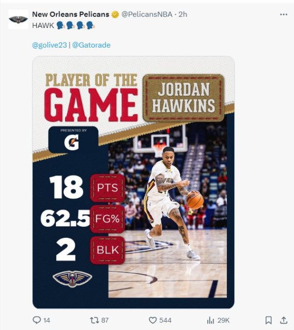 鹈鹕此役四人得分上双,锡安-威廉森19分钟,11中8拿到16分8篮板3助攻2抢断发挥出色;泰斯20分钟,7中6+三分1中1拿到13分2篮板1助攻2抢断;霍金斯8中5+三分5中2+罚球7中6拿到18分;希尔5中3拿下11分。也就是说CJ、穆雷、琼斯都没上双。