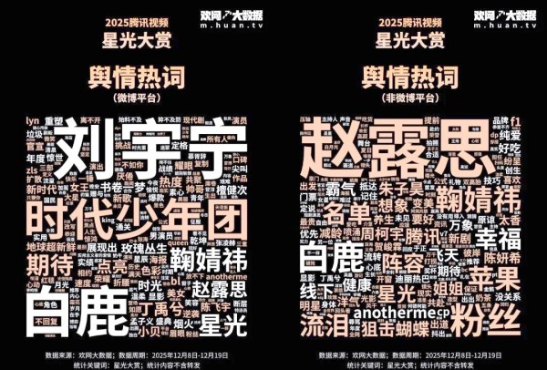 欢网大数据的多平台舆情热词报告进一步印证了这一观察。在男明星方面,除了刘宇宁外,05后的时代少年团成员在相关话题中展现出了极高的人气;而在女明星阵营中,赵露思、白鹿、鞠婧祎、孟子义等90后代表则稳坐一席之地。
