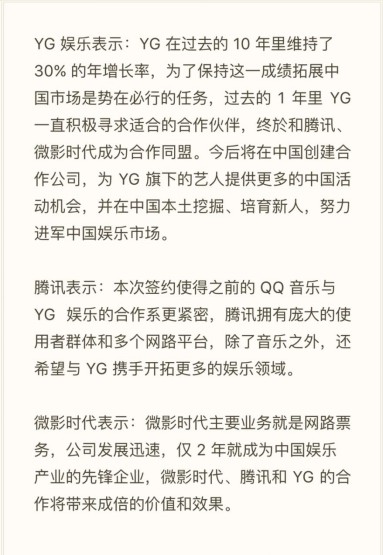 YG公司一向和腾讯关系密切,早在2014年12月,腾讯旗下的QQ音乐就曾与YG娱乐,达成中国地区网络音乐独家版权及版权总代理战略合作。