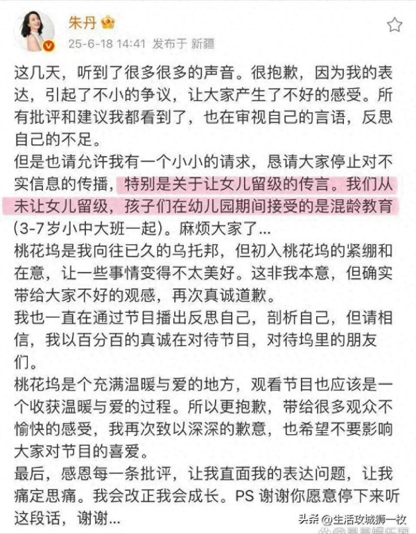 朱丹在道歉声明中,主要提起了她的女儿没有留级一事,并且不遗余力地夸赞了节目组,同时分享了自己的参与感受。然而,让人困惑的是,她并未给予“鸡腿留给弟弟”这一争议事件以明确的回应。在节目中,宁静张罗了一桌美味,朱丹在分配之际,毫无犹豫地将鸡腿递给了弟弟,这一举动如同在平静的湖面投下了一颗石子,瞬间激起了千层浪。