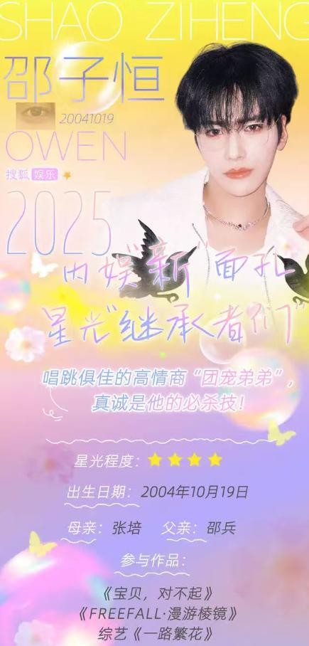 邵子恒的"暖男形象"与动作戏实力形成奇妙反差。在《一路繁花》中,他既能化身暖心弟弟照顾前辈,又能在《风与潮》中完成高空威亚动作,这种"文武双全"的特质,让他成为综艺与影视的"双栖新星"。